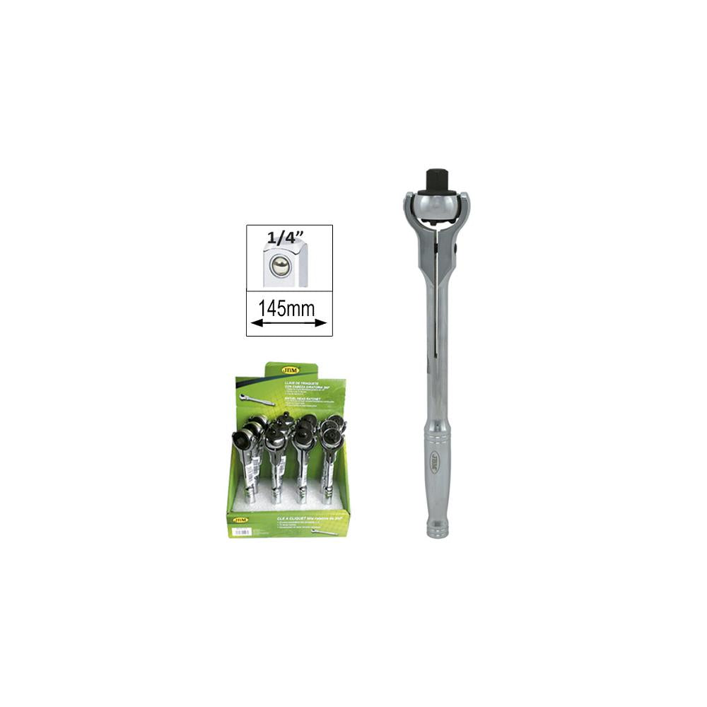 Cliché-ul JBM de 1/4`, cu 72 de dinti si cap rotativ, este ideal pentru lucrari de precizie in spatii inguste. Dotat cu un maner metalic ergonomic si durabil, ofera un control excelent si o manevrare usoara. Capul rotativ faciliteaza accesul in unghiuri dificile, iar mecanismul cu 72 de dinti asigura un cuplaj precis si eficient. Perfect pentru utilizarea in ateliere de reparatii si proiecte de mecanica.