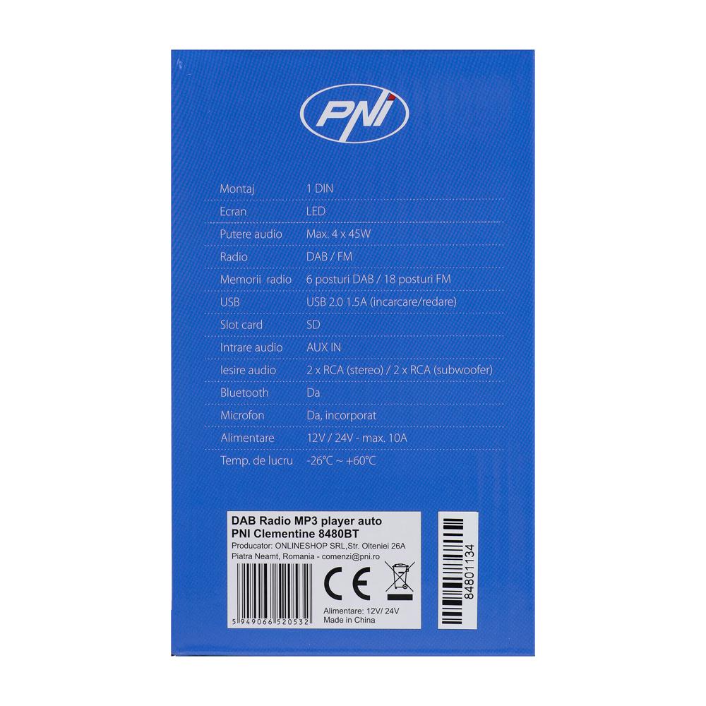 RADIO MP3 PLAYER AUTO DAB SI RDS PNI CLEMENTINE 8480BT 4X45W, 12/24V, CU SD, USB, AUX, RCA, BLUETOOTH SI USB 1.5A